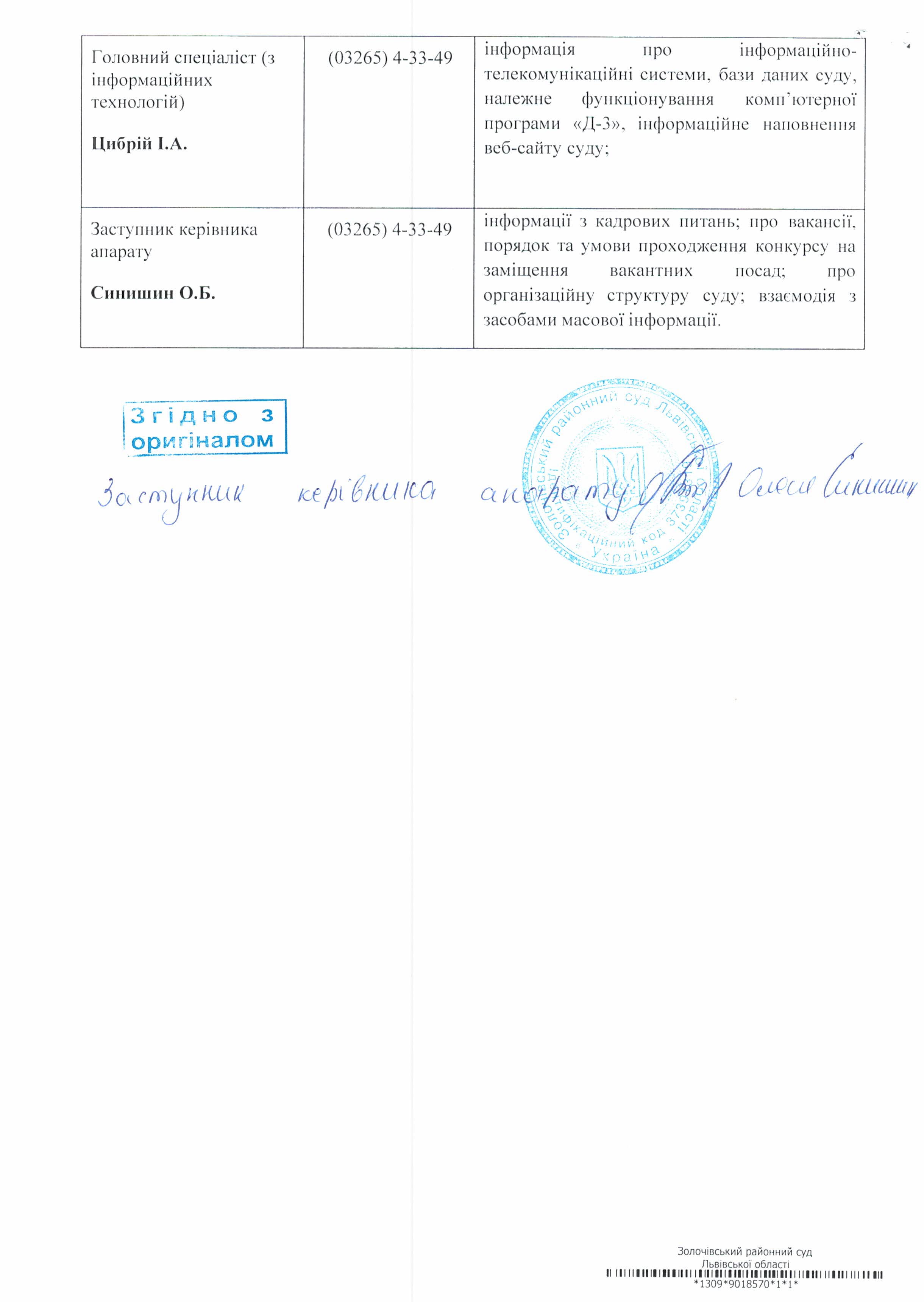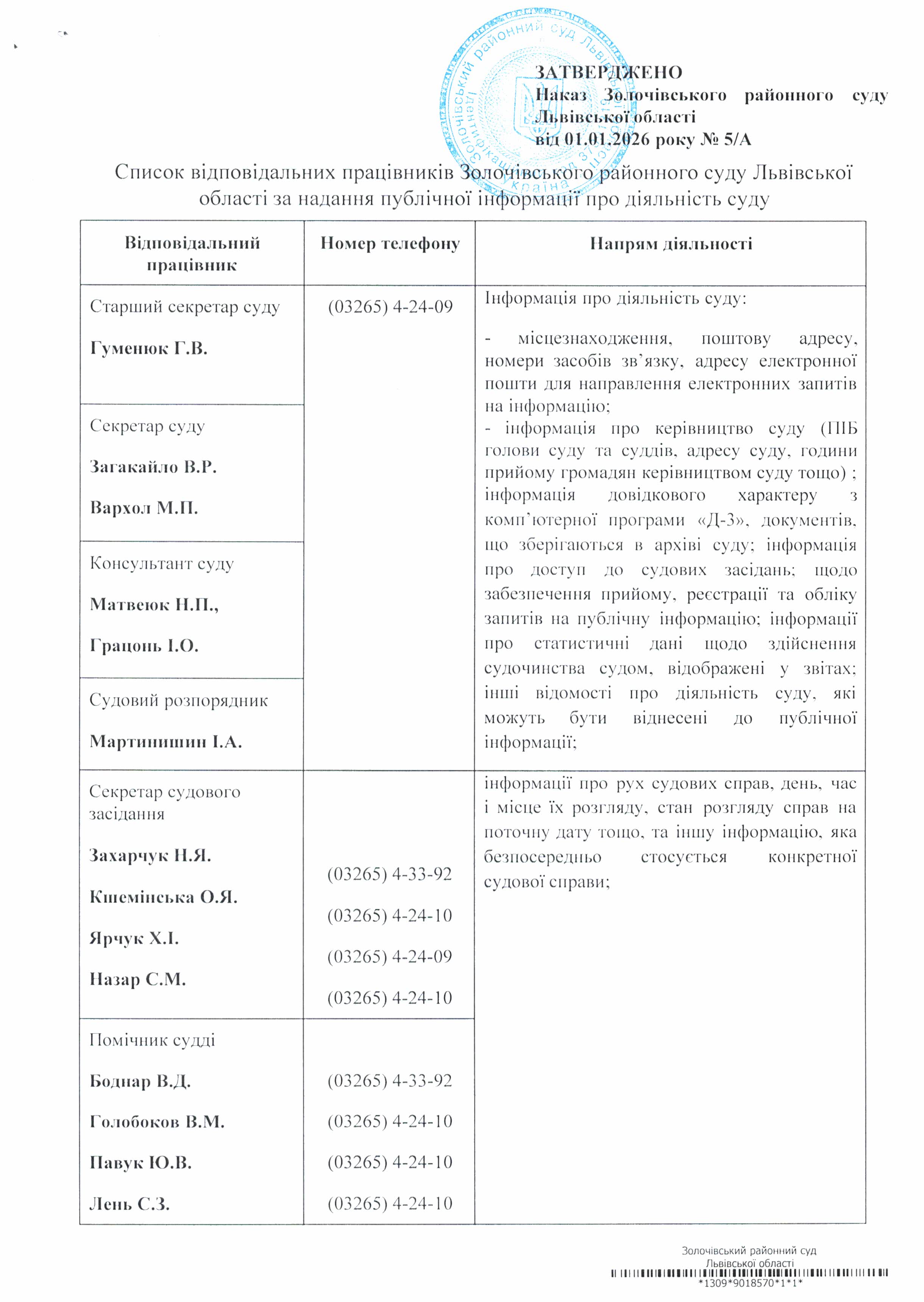 Список осіб, відповідальних за забезпеченя доступу до інформації, з зазначенням контактних телефонів