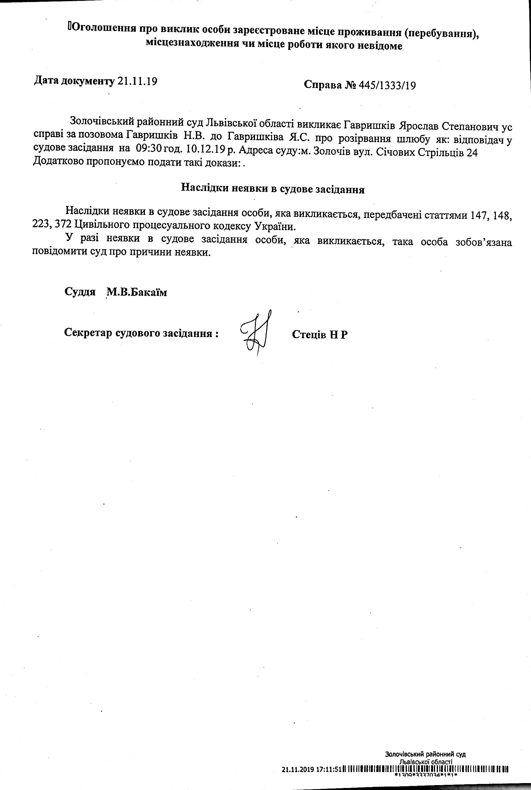 Оголошення про виклик в судове засідання Гавришківа Ярослава Степановича відповідача по справі № 445/1333/19 на 10.12.2019 р. о 09:30 год.