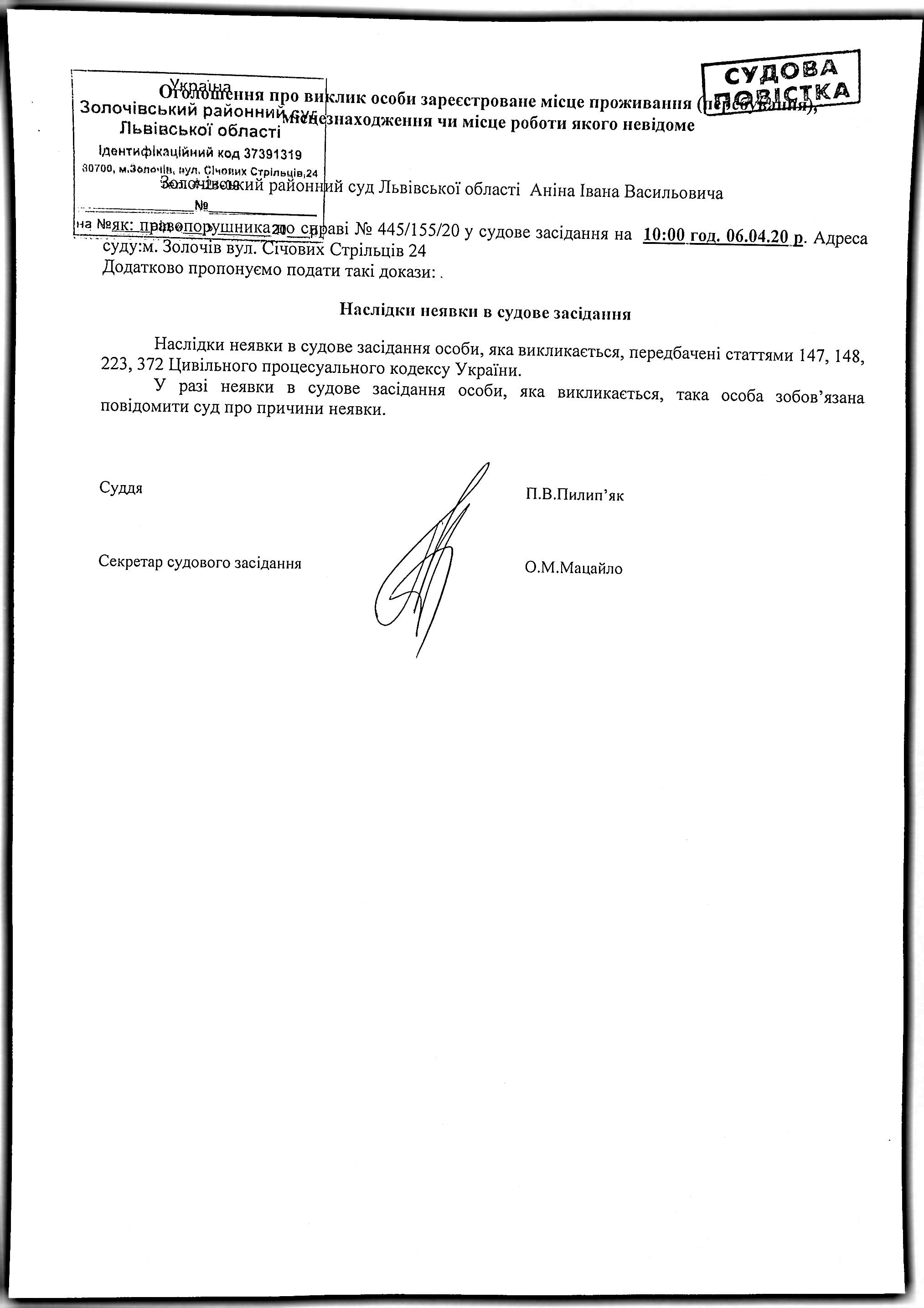 Оголошення про виклик в судове засідання Аніна Івана Васильовича правопорушника по справі № 445/155/20 на 06.04.2020 року о 10:00 год.